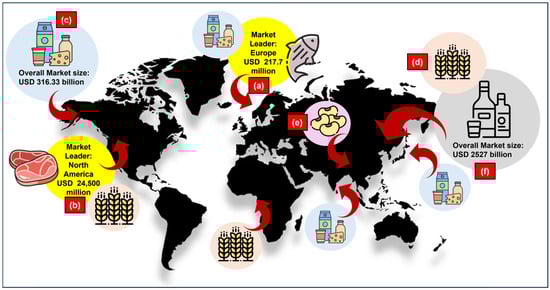 Fermented meat products represent a significant segment of traditional and functional foods, offering both preservation advantages and potential health benefits. Meat fermentation, which has historically been used to improve flavour, texture, and shelf life, has changed with the introduction of probiotic starter cultures to create functional fermented meat products [24]. For example, Lactobacillus plantarum, Staphylococcus xylosus, Pediococcus pentosaceus, and Micrococcus spp. are used for the fermentation of meat products in China, including Guizhou sour meat, Sichuansausage, and Jinhua ham. These strains lead to the production of key metabolites such as esters, alcohols, acids, free amino acids (FAAs), and antioxidant peptides. They also develop flavour and suppress harmful compounds like nitrites and biogenic amines [19]. Similarly, Staphylococcus carnosus, Lactobacillus sakei, and Pediococcus acidilactici are found in fermented meats like Spanish Chorizo and Italian Salami in Europe. These microorganisms aid in immune system function, gut microbiota balance, and cholesterol metabolism [8]. The production of bioactive compounds, enzymatic activity, and probiotic composition are the main reasons for the health advantages of fermented meat and fish products. Bile salt hydrolases (BSHs), which lower cholesterol and promote cardiovascular health, are produced by lactic acid bacteria (LAB) strains like Lactobacillus curvatus [25] and Staphylococcus xylosus [26,27]. Further, fermentation improves the bioavailability of essential amino acids, omega-3 fatty acids, and vitamins, which improve gut microbiota balance, metabolic stability, and overall health [28]. Additionally, L. plantarum [29] and P. pentosaceus [30] produce antioxidant peptides that combat oxidative stress and inflammation, potentially improving cardiovascular health and immune function. The global market for fermented meat products was estimated to be at USD 149.76 billion in 2023, and is expected to grow from USD 161.78 billion in 2024 to USD 300 billion in 2032 at a CAGR of 8.02%, with the largest market share from North America (USD 24.5 billion), followed by Europe (USD 22.8 billion) in 2023 [31]. In another report, the Asia–Pacific region was found to be dominating the fermented meat market, followed closely by North America in 2024 [32]. Geographically, North America, Europe, and Asia–Pacific were the main consumption markets in 2022, and together, they accounted for the majority of the global volume sold. In conclusion, the market for fermented meat products is expanding due to both the growing global demand for convenient, tasty, and nutrient-dense meat products and technological developments in fermentation.