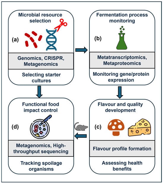 Integrated multi-omics approach in fermented food systems: (a) selection of cultures; (b) monitoring of fermentation process; (c) development of flavour; and (d) tracking spoilage organisms.