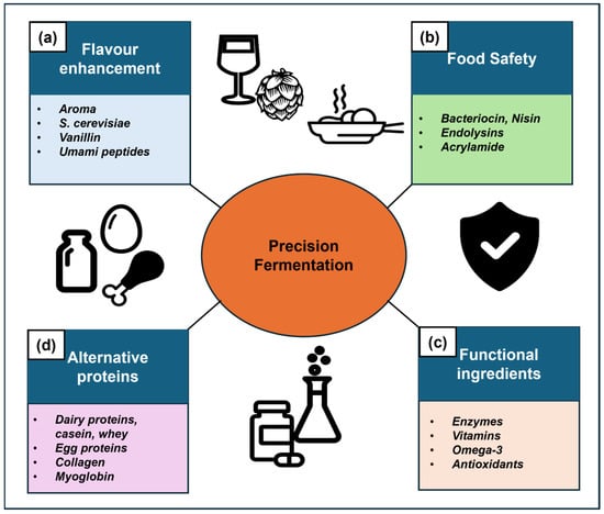 Therefore, precision fermentation aids in the production of alternative proteins (e.g., casein, whey, myoglobin, and hemoglobin) for plant-based dairy and meat substitutes, vitamins, and bioactives (e.g., vitamin B12, omega-3, and antioxidants) to enhance nutritional value, flavours, and texturizers (e.g., vanillin, umami peptides, and polysaccharides) and improve sensory attributes and functional enzymes (e.g., chymosin, amylase, and pectinase) for food processing efficiency [11].