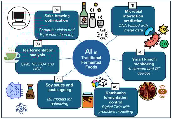 Examples of role of AI and ML in food fermentation: (a) use in sake brewing; (b) use in tea fermentation analysis; (c) use in ageing of Soy Sauce and paste; (d) use in Kombucha fermentation control; (e) use in Kimchi production; and (f) use to predict microbial interaction.