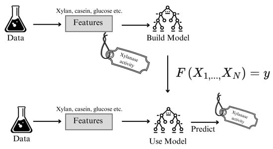 Figure 1 illustrates the workflow of building and applying a machine learning model for predicting xylanase activity based on experimental input variables. Initially, data obtained from laboratory experiments—including features such as xylan, casein, and glucose concentrations—are used to train a predictive model. During the training phase (top row), these features are paired with experimentally determined xylanase activity values to construct a supervised learning model.Once the model is trained, it can then be applied to new data points (bottom row), where the same set of input features is fed into the model to generate predicted xylanase activity values. This approach allows for the estimation of enzymatic performance without conducting additional experiments, thereby facilitating process optimization and decision making in a data-driven manner.