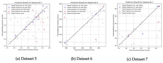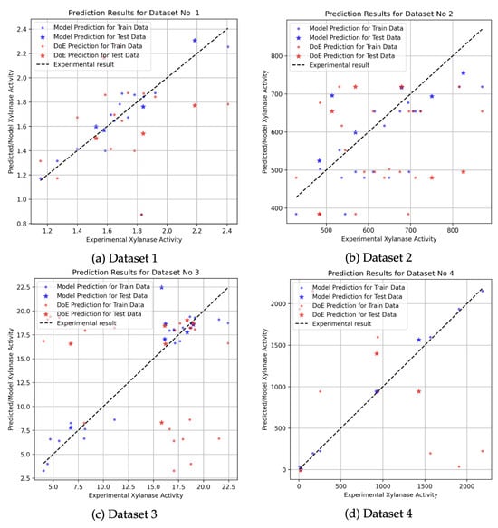 The fermentation study conducted by Pham et al. [23] investigated xylanase production by Bacillus sp. I-1018 by optimizing three critical parameters: xylan, casein, and ammonium chloride concentrations. In Figure 3d, detailed in Table A7, the model prediction data are situated near the black dashed line, whereas the DOE predictions exhibit a wider dispersion. The increased frequency of the red points signifies a bigger variance in the predictions; however, a lower variance in the model’s prediction data implies that the model produces successful outcomes.