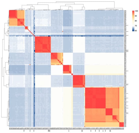 Among the 151 strains of Bacillus that have been sequenced, we performed genome analysis on all of them, with results shown in Table S1, including genome completeness and contamination levels. The size of the Bacillus genomes ranged between 2.49 million base pairs (Mb) (B399) and 9.38 Mb (B778), with an average size of 4.75 ± 0.08 Mb. The G + C content varied from 32.50% to 73.06% (average 40.50 ± 0.38%), reflecting the genetic diversity within the genus. The number of coding sequences (CDS) ranged from 2265 (B399) to 9047 (B778), with an average of 4769.18 ± 83, and contig numbers varied between 10 (B843) and 2952 (B778), with an average of 90.21 ± 23.25 (Supplementary Table S1). Gene annotation ratios were consistently high (>90%) across all strains, indicating high-quality genome sequencing and annotation (Figure 1B). Notable differences in repetitive sequences were observed, with strains B881 (765), B860 (760), and B762 (745) containing the highest numbers (Figure 1A). Average nucleotide identity (ANI) analysis revealed both similarities and differences among the 151 strains, with a mean ANI value of 72.63% ± 10.82%. While most ANI values distributed between 60% and 70%, some strains showed remarkable similarity, such as B371 and B647 (99.17%), B594 and B822 (99.18%), indicating close evolutionary relationships. These findings highlight the genomic diversity within the Bacillus species and provide important insights into their genetic relationships and evolutionary history (Figure 2).