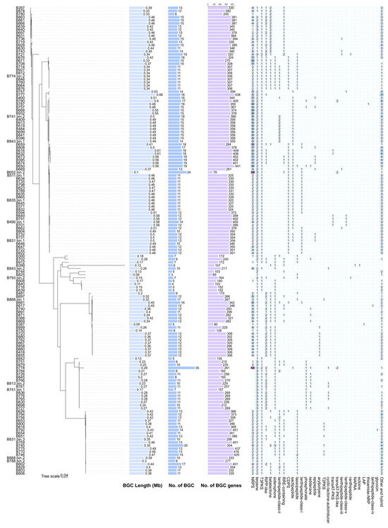 Phylogenetic tree of 151 core genes; the length, number, and number of biosynthetic gene clusters; and the types and number of biosynthetic gene clusters corresponding to each strain.