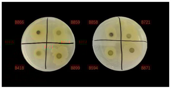 Based on the comprehensive genome analysis, we identified 120 strains containing CDA-encoding genes from the 151 Bacillus strains. We then designed a screening method based on the chemical reaction where CDA catalyzes the deacetylation of p-nitroacetanilide to produce p-nitroaniline, resulting in a distinctive color change from colorless to yellow. Using this approach, we conducted an initial screening of all 120 strains, which revealed that 95 exhibited measurable enzymatic activity following cultivation. Further secondary screening identified five strains with exceptional CDA activity: B721, B858, B866, B871, and B899 (Figure 5). For confirmatory analysis, we inoculated these five high-performing strains into fresh selection medium and incubated them at 30 °C with agitation at 180 rpm for 48 h. Following incubation, we measured sample absorbance using an ultraviolet spectrophotometer and calculated the corresponding CDA activity. The quantitative results are presented in Table 1.