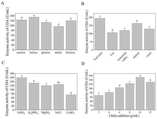 Effects of different carbon sources on CDA enzyme activity; (A) Effects of different nitrogen sources on CDA enzyme activity; (B) Effects of different inorganic salts on CDA enzyme activity; (C) and Effect of chitin addition on CDA enzyme activity (D). Values with the same superscript letters in the same line were not significantly different (p > 0.05); values with different letters were significantly different (p < 0.05).