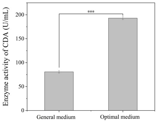 To enhance CDA production in Bacillus pumilus B866, we systematically evaluated the effects of various carbon sources, nitrogen sources, inorganic salts, and chitin concentrations on enzyme activity. Carbon source optimization showed that lactose could significantly promote the synthesis of CDA. By detecting the enzyme activity in the supernatant of fermentation broth, it was found that the enzyme activity reached 134.27 U/mL when lactose was used as the carbon source (Figure 6A). Compared with other carbon sources (such as glucose, sucrose, etc.), lactose was selected as the optimal carbon source. Nitrogen source screening experiments showed that yeast extract had the most prominent effect on the synthesis of CDA. In the medium containing yeast extract, the enzyme activity reached 187.38 U/mL (Figure 6B), which was higher than that of other nitrogen sources (such as peptone, ammonium sulfate, etc.). About 20–40%, indicating that yeast extract can effectively support cell metabolism and enzyme expression by providing abundant organic nitrogen components. It was found that ferrous sulfate played a key role in maintaining the enzyme activity. After the addition of ferrous sulfate, the activity of CDA increased to 158.32 U/mL (Figure 6C), suggesting that it may participate in the conformational stabilization of the enzyme by regulating osmotic pressure or as a cofactor. In further investigation of chitin concentration on enzyme production, the results showed that when the addition of chitin was 10 g/L, the enzyme activity reached the peak (147.91 U/mL, Figure 6D). The substrate limitation effect was significant at low concentration (<10 g/L), while high concentration (>10 g/L) may lead to substrate inhibition or insufficient dissolved oxygen, resulting in the decrease in enzyme activity. Based on the above results, the optimal medium formula was determined as follows: lactose (carbon source), yeast extract (nitrogen source), ferrous sulfate (inorganic salt), and 10 g/L chitin. The verification experiment demonstrated that the CDA enzyme activity of the optimized medium was 191.32 U/mL (Figure 7), which was 2.39 times higher than that of the original medium and was significantly higher than the highest value (187.38 U/mL) when each single variable was optimized, indicating that the multi-component collaborative optimization had a superimposed gain effect on the enzyme activity.