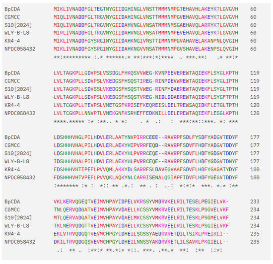 BpCDA (Genbank: PV243451), CGMCC (Genbank: WP_377883600.1), S10(2024) (Genbank: WP_429756702.1), WLY-B-L8 (Genbank: WP_306199099.1), KR4-4 (Genbank: WP_375376849.1), NPDC058432 (Genbank: WP_390310904.1). Sequence alignment generated using Clustal Omega (default settings) via https://www.ebi.ac.uk/jdispatcher/msa/clustalo (accessed on 3 June 2025). (asterisk): Denotes positions with identical residues across all sequences. (colon): Denotes positions with conserved substitutions (residues sharing similar physicochemical properties). (period): Denotes positions with semi-conserved substitutions (residues sharing weaker physicochemical similarity).