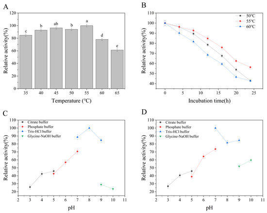 (A) Effect of temperature on BpCDA, (B) Effects of temperature on the stability of BpCDA, (C) Effects of pH on the activity of BpCDA, (D) Effects of pH on the stability of BpCDA. Values with the same superscript letters in the same line were not significantly different (p > 0.05); values with different letters were significantly different (p < 0.05).