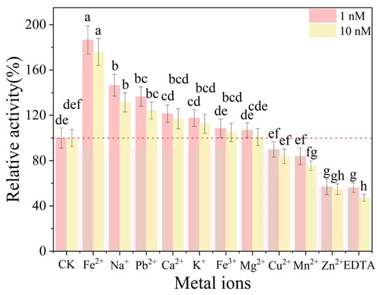 To assess BpCDA’s metal ion stability, enzyme activity was measured with Fe3+, Cu2+, Ca2+, Mn2+, Fe2+, Mg2+, Zn2+, Pb2+, K+, Na+, and EDTA(1 nM and 10 nM) (Figure 11). Fe2+ demonstrated exceptional activation potential, elevating relative activity to 186.4% at 1 nM compared to control. Divalent cations exhibited differential responses: Na+ showed substantial enhancement (146.6% at 1 nM), while Zn2+ caused significant suppression (54.7% at 10 nM), contrasting with Ca2+’s neutral response (103.2–107.5%).