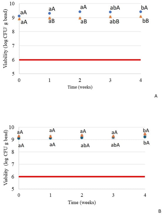 Effect of alginate bead concentrations of 1.5% (A) and 3% (B) during an immersion time of 8 min on the viability of probiotics for 4 weeks. Similar lowercase letters indicate no significant difference during storage (p > 0.05). Similar capital letters indicate no significant difference between treatments at each time point (p > 0.05). Without chitosan (•); with chitosan (▴). The red line represents the value (6 Log10 CFU/g) reported by the FAO/WHO [] for food to have a beneficial effect.