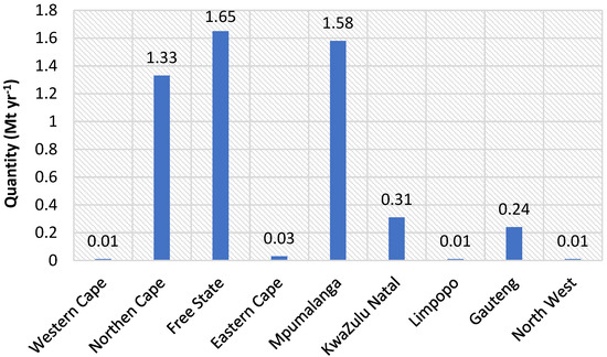 South Africa is popularly known for producing vast amounts of the maize grain. Reports have indicated that the country is the leading producer of maize in Africa. Approximately 16.4 million Mt yr−1 of maize is harvested from 2.6 million ha of land in South Africa [1]. Maize production generates large volumes of non-grain biomass residues. The residue-to-grain production ratio for the maize crop is 1:1 [27]. MS is the main by-product from harvesting and processing of the maize grain. The residue contains different fractions of stalks, husks, cobs, leaves, and other left-over residues in variable proportions [3,4]. MS covers around 47–50% of the total maize harvest on a dry-weight basis [3]. MS fractions were reported as 27.5% stalks, 8.2% cobs, 11.4% leaves, and 7.0% husks on a dry matter basis [29]. Mensah et al. [4] reported the percentage dry weight distribution for MS fractions of 9.4% for the cob and 44.3% for the combined husk, leaf, and stalk. Current aggregated data on the generation of MS in South Africa are not well-updated. However, Batidzirai et al. [5] reported that South Africa produced an average of 5.15 Mt yr−1 of MS between 1990 and 2011. Stover generation capacity is likely to outweigh this by 126% up to about 11.66 Mt yr−1 if agricultural practices and technologies are well-reformed [5]. The distribution of MS production by province in South Africa is shown in Figure 1. Around 89% of the stover comes from the Free State, Mpumalanga, and Northen Cape, the most significant maize producers in South Africa [5].