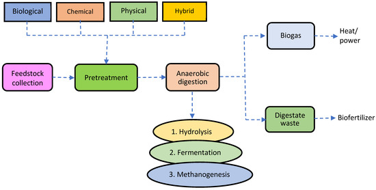 MS contains large amounts of organic matter. It is a rich resource of fermentable sugars amenable to anaerobic digestion (AD). AD presents a unique opportunity to recover energy from biomass while mitigating environmental concerns [7,8]. It is a biochemical process that produces biogas, a renewable energy resource. The primary components of biogas are methane (CH4) and carbon dioxide (CO2). In AD, organic matter is degraded synergistically using bacteria consortia in the absence of oxygen [8,9]. AD involves three major steps, namely hydrolysis, fermentation, and methanogenesis. Biogas is generated through the degradation of fermentation products during the methanogenic step [8,10]. MS is composed of a compact three-dimensional matrix of cellulose, hemicelluloses, and lignin. This structural complexity prolongs the residence period of MS in biodigesters [11,12,13]. Hydrolysis is the rate-limiting step, which dictates speed of the entire AD process. Despite these constraints, MS is a potent feedstock for biogas production. Studies have reported good theoretical biomethane potential (BMP) from MS in the range of 377.9 to 421.1 mL g−1 VS [14]. It is noteworthy that the real BMP of MS rarely exceeds the hypothetical CH4 values. This calls for an acceleration of the degradation of MS.