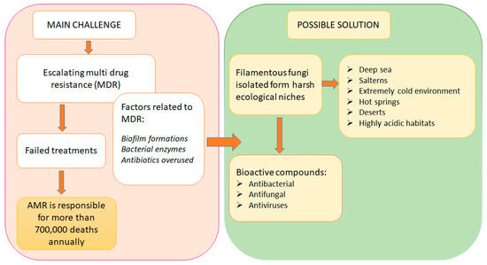 Beyond stewardship and surveillance, the discovery and development of new antimicrobial compounds remain critical. Natural sources—particularly those derived from extremophilic organisms—represent a promising frontier in antibiotic innovation. Extremophilic fungi, which thrive in extreme environments characterized by high temperature, salinity, acidity, or radiation, produce unique bioactive secondary metabolites that may serve as scaffolds for next-generation antimicrobials [37]. These organisms have evolved biochemical adaptations that confer resistance to environmental stressors, and in doing so, generate compounds with potent antimicrobial activity. Preliminary studies have highlighted the potential of extremophilic fungi to produce novel enzymes and metabolites with clinical relevance, offering a valuable reservoir for antibiotic discovery [38]. Figure 2 presents the role of extremophilic filamentous fungi in solving the problems with AMR.