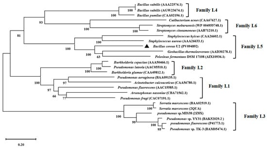 Amino acid phylogenetic analysis of LipU. All of the lipases shown belong to bacterial lipolysis enzyme Family I. The source strain of the target lipase, Bacillus cereus U2, is marked with a black triangle (▲).