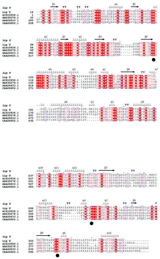 Multiple sequence alignments of LipU and other lipolytic enzymes belonging to the I.5 Subfamily. LipU (PV094892) was aligned with Pelosinus fermentans DSM 17108 Lipase (AIX10936.1; 53.32% identity), Geobacillus thermoleovorans Lipase (AAD30278.1; identity 46.34%), Staphylococcus aureus Lipase (AAA26633.1; identity 39.90%), and Staphylococcus hyicus Lipase (CAA26602.1; identity 37.22%) according to ClustalW2 and Espript3.0 procedures. Catalytic triplets (Ser121, His363, and Asp323) are highlighted with black circles (●).