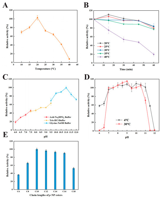 Characterization of recombinant LipU. (A) Effect of temperature on LipU (20–50 °C, pH 11). (B) Thermal stability of LipU (20–40 °C, pH 11). (C) Effect of pH on LipU activity (25 °C). (D) Effect of pH stability (6.0–12.0). (E) Substrate specificity of LipB for various p-NP esters (C6–C18), where the number indicates the carbon chain length.