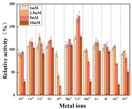 In industrial applications, reaction mixtures often contain metal ions that can significantly affect lipase activity. To investigate this, 12 metal ion solutions were tested for their effects on LipU activity. As shown in Figure 5, LipU activity was enhanced in the presence of Cu2⁺, Co2⁺, Na⁺, Ca2⁺, Mg2⁺, and Li⁺. Specifically, Ca2⁺ and Mg2⁺ increased enzyme activity by 172% and 126%, respectively, aligning with previous studies where Ca2⁺ and Mg2⁺ were found to be major contributors to the activity of lipase from Pseudomonas fluorescens [34]. This activation is likely due to conformational changes in the lipase upon metal ion binding, which form salt bridges. These interactions facilitate the release of fatty acids during hydrolysis, creating insoluble salts that enhance both enzyme stability and catalytic activity [35,36]. Interestingly, Cu2⁺ did not inhibit LipU activity, as typically observed with conventional lipases; instead, it promoted enzyme activity. Similar findings have been reported for lipases from Candida rugosa [37], where Cu2⁺ also served as an activator. The increased negative surface charge of LipU under alkaline conditions may reduce the binding of Cu2⁺ to key carboxylic acid residues due to electrostatic repulsion.