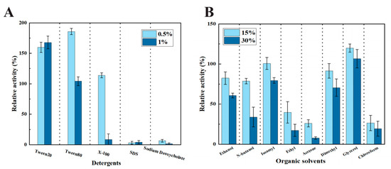(A) Effect of surfactants on the activity of LipU; (B) effect of organic solvent on the activity of LipU.