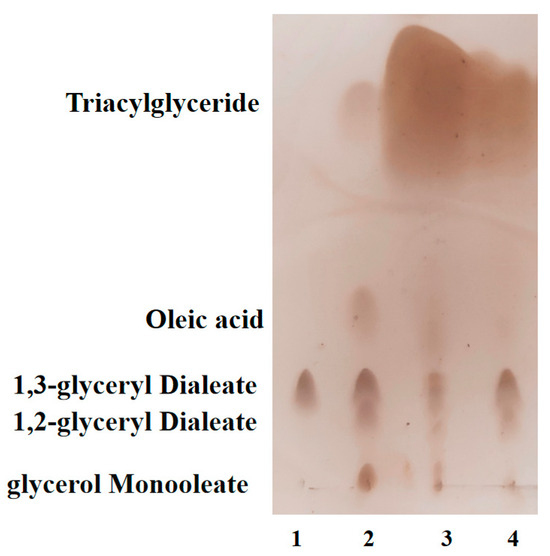 The reaction system consisted of 2 mL of glycine–NaOH buffer (50 mM, pH 11.0), 1 g of fish oil, and 1 mL of crude LipU enzyme solution. After purging with nitrogen for 1 min, the reaction vessel was sealed and incubated at 20 °C, with shaking taking place afterwards at 200 rpm for 12 h. The reaction was terminated by placing the mixture in a boiling water bath for 10 min. To prepare the samples, the reaction mixture was dissolved in 50 mL of hexane, followed by the addition of 20 mL of 0.5 M ethanolic KOH solution and vigorous mixing. The upper organic phase, containing glycerides, was washed three times with 20 mL of purified water, and the solvent was removed by rotary evaporation at 55 °C and 50 rpm for 20 min. The products were analyzed using thin-layer chromatography (TLC) on 0.2 mm silica gel plates (10 cm × 20 cm). Samples dissolved in hexane were applied to the TLC plates, which were developed in a solvent system of hexane/ether/acetic acid (v/v/v, 85:15:1), dried with heat, and compared with standard compounds from Sigma (St. Louis, MO, USA).
