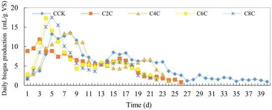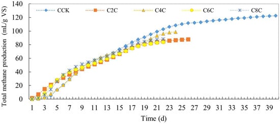 In examining the total biogas production curve for the cow dung experimental group (Figure 3), it is evident that during the initial 9 days, all experimental groups exhibited higher production than the CCK control group. This can be attributed to the inclusion of biochar, which enhanced the efficiency of anaerobic fermentation, subsequently leading to a minor decrease in overall gas production. Notably, post the 23rd day, the total gas production for all experimental groups was observed to be lower than that of the CCK control group. Nevertheless, it is worth noting that the gas production in this study’s experimental groups surpassed the 112.5 mL/g VS recorded for cow dung alone digestion as documented by Xu et al. [27].