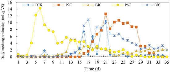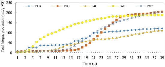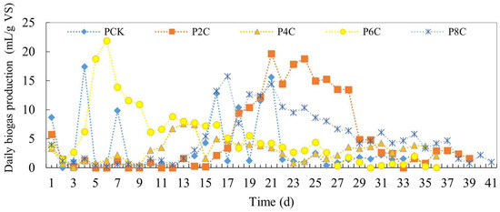 The daily gas production from pig manure fermentation augmented with biochar is illustrated in Figure 4. Notably, the P6C experimental group exhibited the highest daily gas production, reaching up to 21.91 mL/g VS, and this group also reached its peak gas production the most rapidly. This suggests that the addition of biochar can enhance gas production and stabilize the process. However, the impact of biochar on the duration of the gas production cycle was not significant. The reaction in the control group concluded on the 35th day, while the fermentation cycle for the groups with added biochar ranged from 30 to 39 days. Among these, the reaction speed was fastest with 6% biochar added, concluding on the 30th day.