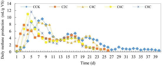 As illustrated in Figure 2, significant fluctuations were observed in the daily gas production of cow manure fermentation groups upon the addition of biochar. Notably, the maximum daily gas production was recorded on the fifth day in the C8C group, registering at 17.48 mL/g VS. When examining the duration of the gas production cycle, it was found that the anaerobic fermentation cycle was notably shortened post-biochar addition. The control group, which did not receive biochar, completed its anaerobic fermentation by the 40th day post-initiation. However, for the experimental groups receiving biochar, the fermentation process concluded on the 22nd day for both the C6C and C8C groups, while the C2C group completed its cycle on the 26th day. This underscores that biochar supplementation considerably reduces the fermentation duration. Furthermore, in terms of daily gas production, biochar supplementation appears to amplify the peak daily gas output. Specifically, the C2C group reached its peak on the third day, the C6C group (with 6% biochar) achieved its apex on the fourth day, and the C8C group peaked on the fifth day. In contrast, the control CCK group only attained its maximum gas output on the seventh day.