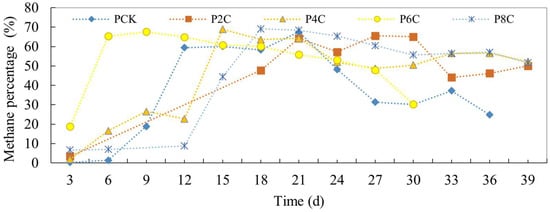 The alterations in methane percentage within the pig manure experimental group are depicted in Figure 8. During the initial 9 days, the group with added biochar exhibited a slightly elevated methane percentage compared to the control group. Specifically, the addition of 6% biochar led to the quickest onset of methane production, while 8% biochar caused a slight delay in reaching the peak gas production. Overall, the methane percentage increased in each group that received biochar.