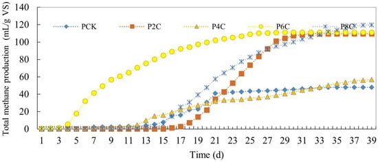 The daily methane production of the pig manure biochar group is shown in Figure 10. The figure indicates that, after adding biochar, the total methane production of each experimental group exceeded that of the control group. The P6C experimental group quickly produced methane and its total output exceeding that of the control group. The P8C experimental group, which produced the most methane, reached 119.74 mL/g VS, while the fastest gas-producing P6C experimental group was 111.25 mL/g VS, far exceeding the 47.86 mL/g VS of the control group.