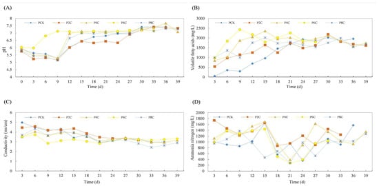 Effect of physicochemical properties of anaerobic co-digestion of pig manure by adding biochar ((A): pH, (B): VFAs, (C): EC, and (D): ammonia nitrogen).