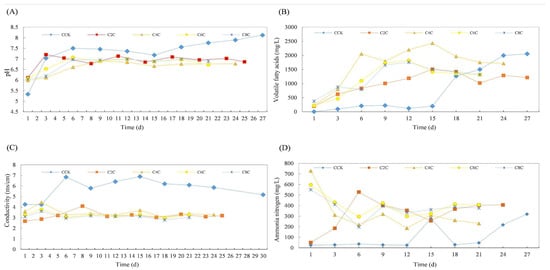 Effect of physicochemical properties of anaerobic co-digestion of cow dung by adding biochar ((A): pH, (B): VFAs, (C): EC, and (D): ammonia nitrogen).