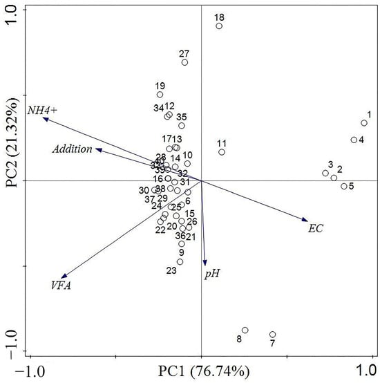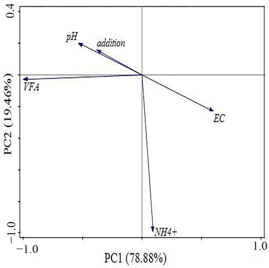 The results of the PCA on the swine manure experimental group are presented in Figure 14. In the experiment concerning swine manure fermentation with biochar addition, the PC1 and PC2 accounted for 78.88% and 19.46% of the variability in methane production, respectively. The analysis revealed a significant positive correlation between biochar addition and pH, while it demonstrated a substantial negative correlation with alterations in EC. This suggests that biochar potentially influences the activity of anaerobic bacteria by impacting changes in pH and EC, thereby affecting methane production. Furthermore, elevated VFAs concentrations were identified as one of the key factors contributing to reduced methane yields. Concurrently, higher NH3-N levels were also identified as a factor leading to decreased methane production.