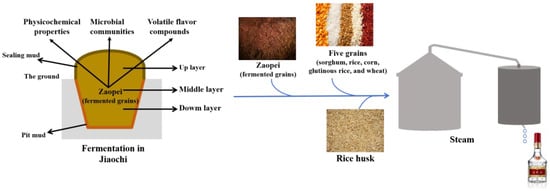 As the leading enterprise, Wuliangye Baijiu ranks among the most favored Baijiu varieties in China with sales reaching CNY 89.1 billion in 2024. Renowned for its distinctive fermentation process and characteristic flavor profiles [,], it enjoys widespread consumption. The most notable feature of Wuliangye Baijiu lies in its fermentation within a specialized mud pit (also called JiaoChi), which created an ideal habitat for microbial proliferation []. The Fresh zaopei, meticulously crafted from a blend of sorghum, rice, corn, glutinous rice, wheat, rice husks, and baobaoqu powder, undergoes a 70-day fermentation within the sealed pit, a crucial process for developing its signature flavor compounds (Figure 1) [,]. Based on production experience, the higher-quality Wuliangye Baijiu is typically distilled from the down level zaopei from older pits. This observation underscores the fact that the continuous usage duration of mud pits has a substantial impact on the fermentation of zaopei at different layers [,,,]. It is commonly accepted that the longer the mud pit has been in use, the better the quality of Wuliangye Baijiu will be [,]. Consequently, it is essential to elucidate the relationship between the quality of Wuliangye Baijiu and the continuous used years of mud pit.