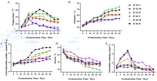 Dynamics of zaopei fermentation properties during Wuliangye Baijiu fermentation. (A) Temperature, (B) moisture, (C) total titratable acidity, (D) starch, (E) titratable reducing sugar. The different color curve represent different layer zaopei samples (blue, red, green, purple, yellow, and black represent JC20-up, JC20-middle, JC20-down, JC40-up, JC40-middle, and JC40-down samples, respectively). Each data point is the mean of three measurements ± SD.