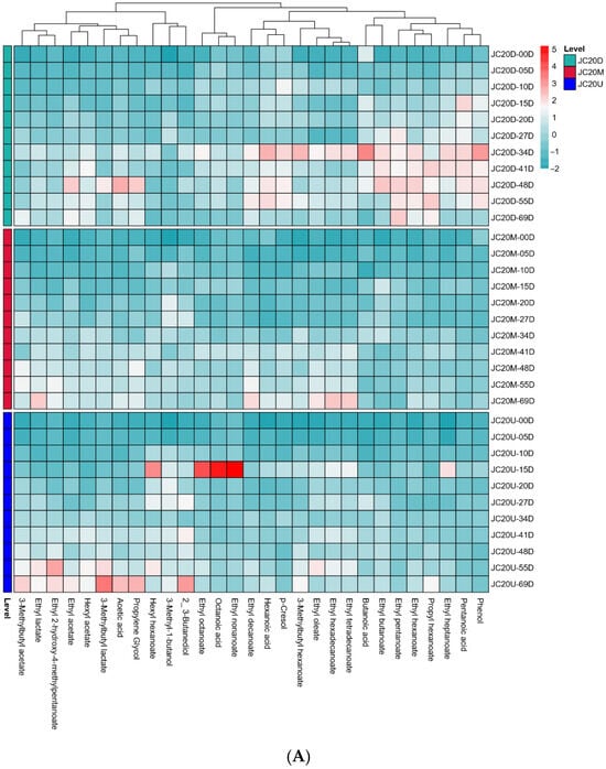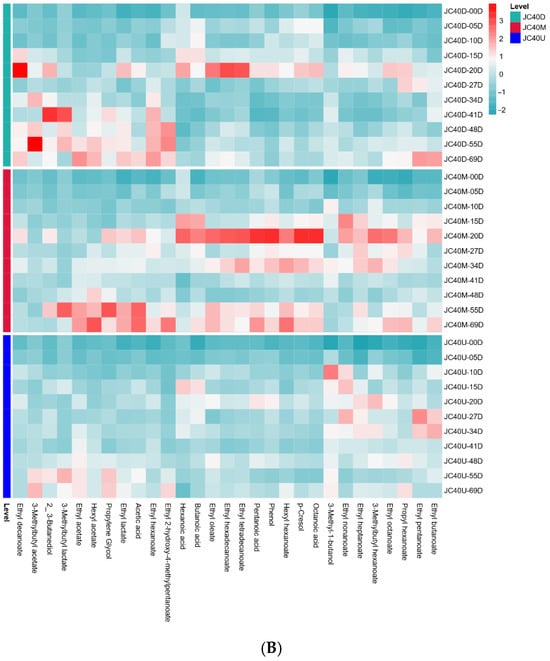 Heat map of changes in differential VFCs during the fermentation of JC20 (A) and JC40 (B).