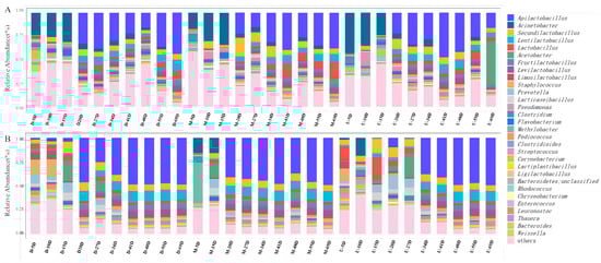Bacteria, a key functional microorganism, secretes numerous hydrolytic enzymes that aid in the formation of flavor compounds during Wuliangye Baijiu fermentation. In JC20, Acinetobacter was a major genus from day 5–15 but its proportion dropped rapidly as fermentation continued. Apilactobacillus became dominant on day 20 and remained so until the end of fermentation in both JC20 and JC40 (Figure 4A,B). Moreover, a notable divergence was observed in the dominant microbial communities of zaopei samples between JC40 and JC20 during the early fermentation stage (Figure 4B), which might be due to the differences in mud pit microorganisms and environmental microorganisms.