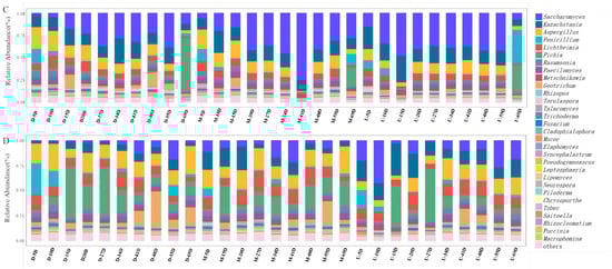Bacterial (A,B) and fungal (C,D) community structure succession at the genus level. A and C (B,D) represent the results of JC20 (JC40).