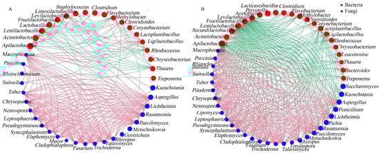 Microbial association networks were constructed for samples JC20 (A) and JC40 (B). Bacterial and fungal nodes are represented by red and blue circles, respectively. Significant positive correlations (r > 0.7, p < 0.05) are denoted by red lines. Significant negative correlations (r < −0.7, p < 0.05) are indicated by green lines.