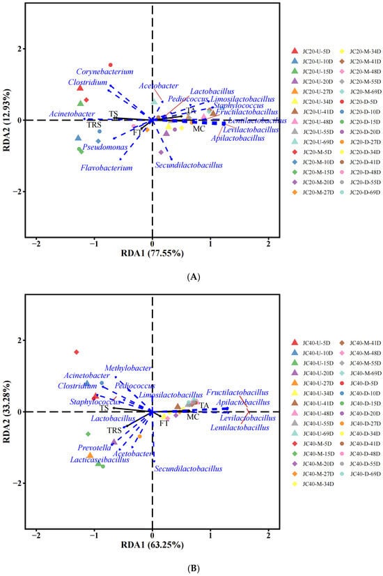 Environmental factors govern the changes in microbial community structures. To elucidate the relationships between microbial communities and physicochemical properties during the fermentation of JC20 and JC40, RDA was conducted (Figure 6). The results demonstrated that the microbial community dynamics were significantly influenced by variables such as total starch content, titratable acid levels, moisture, titratable reducing sugar, and fermented temperature. In terms of bacterial communities, in JC20 fermentation, Acinetobacter, Clostridium, and Corynebacterium were associated with total starch and titratable reducing sugar and Lactococcus, Acetobacter, Staphylococcus, and Pediococcus had significantly positive correlation with titratable acids of JC20 (Figure 6A). As for JC40, Acinetobacter, Clostridium, Methylobacter, Pediococcus, and Staphylococcus were only correlated with total starch over the fermentation of JC40 (Figure 6B). And Fructilactobacillus and Apilactobacillus had significantly positive correlation with titratable acids (Figure 6B). According to previous studies, these bacteria can produce acids by using carbohydrates [,,].