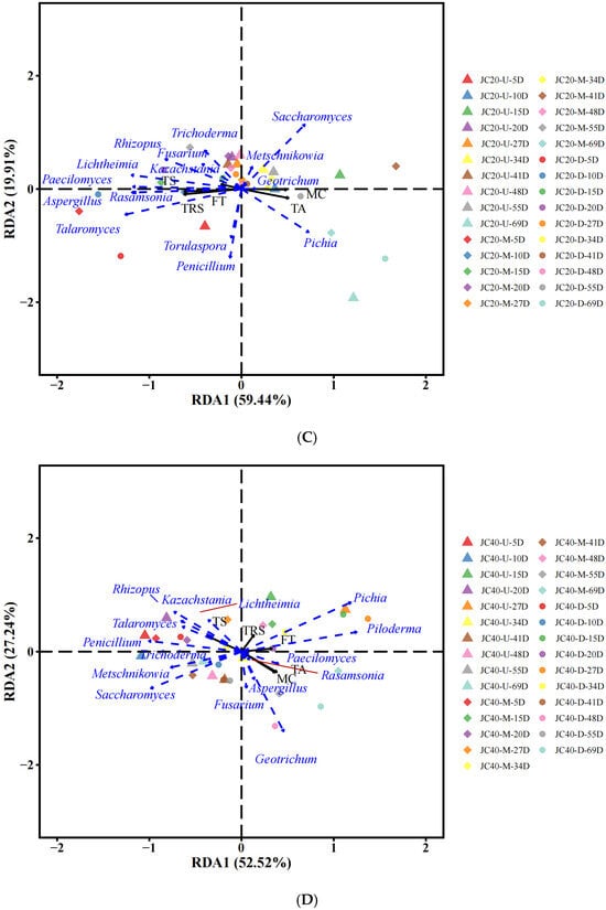 Microbial RDA analysis (top 15 species) and fermentation characteristics. Correlation analysis between fermentation parameters and bacterial genera (A,B) or fungal genera (C,D). (A,C) represent the results of JC20; (B,D) represent the results of JC40. TS: total sugar, TA: titratable acid, MC: moisture content, TRS: titratable reducing sugar, FT: fermented temperature.