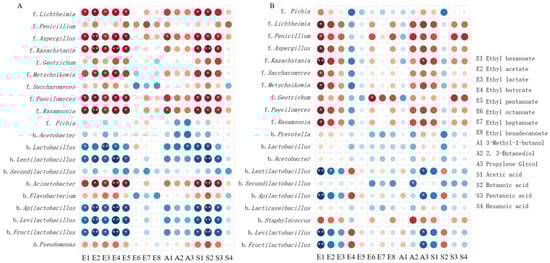 In contrast, most bacteria showed weak relation to the formation of VFCs during the fermentation process, and some bacteria such as Acetobacter, Lactobacillus, Lentilactobacillus, Secundilactobacillus, Apilactobacillus, Levilactobacillus, and Fructilactobacillus showed negative correlation with VFCs synthesis of JC20 (Figure 7A). Similarly, in JC40, Lentilactobacillus, Secundilactobacillus, Apilactobacillus, Levilactobacillus, and Fructilactobacillus showed negative correlations with the production of the majority of VFCs (Figure 7B). As Figure 5 showed, it might be because bacteria showed a negative correlation with fungi.