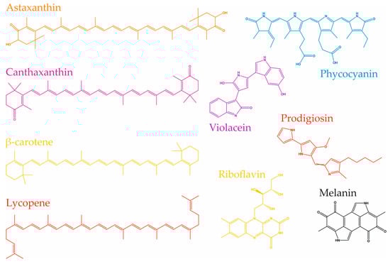 - Barreto, J.V.D.O.; Casanova, L.M.; Junior, A.N.; Reis-Mansur, M.C.P.P.; Vermelho, A.B. Microbial Pigments: Major Groups and Industrial Applications. Microorganisms 2023, 11, 2920. [Google Scholar] [CrossRef]