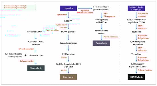 - Ben Tahar, I.; Kus-Liśkiewicz, M.; Lara, Y.; Javaux, E.; Fickers, P. Characterization of a Nontoxic Pyomelanin Pigment Produced by the Yeast Yarrowia lipolytica. Biotechnol. Prog. 2020, 36, 2912. [Google Scholar] [CrossRef]