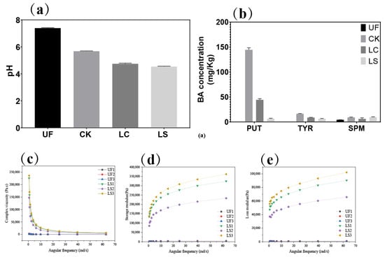 pH (a) and biogenic amines (b) of different groups of fermented giant squid; complex viscosity (c), storage modulus (d) and loss modulus (e) of unfermented and fermented giant squid. UF, CK, LC and LS refer to unfermented samples, non-inoculated samples, samples inoculated with L. casei and samples mixed inoculated with L. casei and S. carnosus, respectively.