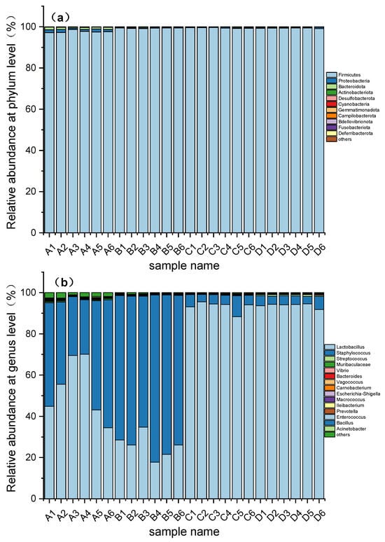 Changes in bacterial community structure at phylum (a) and genus (b) level during different stages of fermentation (Top 15). A, B, C and D refer to the samples at 0 h, 16 h, 32 h and 48 h, respectively. Some legend colors are not well displayed in the bar chart because their proportions are small.