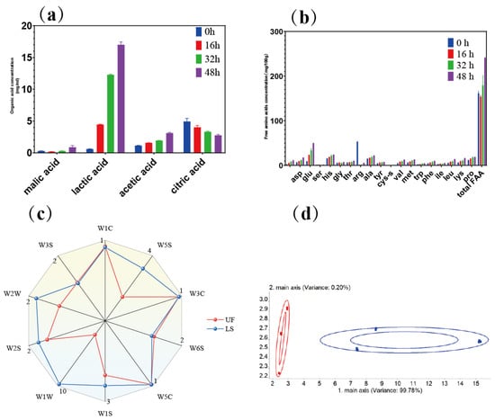 Changes in organic acids (a) and free amino acids (b) during different stages of giant squid fermentation; radar chart (c) and PCA (d) of the results of electronic nose test of unfermented and fermented giant squid. In (b), FAA is short for free amino acid. In (c), UF represent unfermented sample, while LS represent fermented sample mixed inoculated with L. casei and S. carnosus. In (d), red and bule represent unfermented samples and fermented samples, respectively.