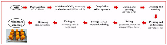 The performance of L73 freeze-dried cells as a ripening agent was studied at the end of a 6-month storage period at 5 °C. In this experiment, L73 vials stored at −20 °C for 6 m were also used as a ripening agent. Three semi-hard cheeses were made per treatment using the following ripening agents: (i) non-ripening agent (NRA), (ii) L73 cells stored at −20 °C for 6 m (RA −20); and (iii) L73 cells stored at 5 °C for 6 m (RA 5). The cheeses were manufactured at a 1-L scale using bovine milk as per Peralta and Bergamini [17]. A flowchart of the cheesemaking process is shown in Figure 1. Briefly, milk was pasteurized at 63 °C for 30 min and then fractionated into a 1-L cheese vat (glass beakers). After supplementing milk with calcium chloride (0.02% w/v) and keeping milk at 38 °C, Streptococcus thermophilus ST12 (Chr. Hansen, Hørsholm, Denmark) was resuspended in milk, and then it was added to all the cheese vats to achieve 1 × 106 cfu mL−1. At that time, the ripening agents mentioned above were added to the cheese vat (at 1 × 106 cfu mL−1). After adding the ChyMax coagulant (Chr. Hansen, 74 IMCU mL−1), milk was held quiescently for approximately 45 min. The curd was then cut and reduced to the size of corn kernels. Keeping gently stirring, the mixture of grains and whey was heated from 38 °C to 45 °C at a rate of 1 °C/min. The cheese vat was gently tilted several times to drain most of the whey, and then the curd was molded into 100-mL perforated collectors. A weight was placed on the top of each of the molded cheeses, and they were acidified in a chamber at 45 °C to reach a pH of 5.3 and immediately submerged in cold sterile brine (20% w/v). Cheeses were stored at 12 °C for 5 days, coated with a yellow commercial paint coating, vacuum-packed in plastic bags, and then returned to the maturation chambers to complete a 120-day ripening period.