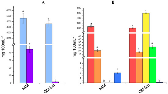 The results of carbohydrates and organic acids concentrations in the cultured milk inoculated with the cells stored for 6 m at 5 °C (CM 6m) and in the non-inoculated milk (NIM) are shown in Figure 2. Both lactose and galactose can be metabolized by L. rhamnosus [39]. The concentration of lactose in NIM and CM 6m was high (~5000 mg 100 mL−1), and only slight numerical differences between the cultured milk and the control were found (p > 0.05). The high level of lactose in fermented milks inoculated with probiotic bacteria (e.g., L. rhamnosus and bifidobacteria) is expected since they usually exhibit slow lactose metabolism capacity and low lactic acid production [37,38]. On the other hand, the concentration of galactose was significantly lower in CM 6m compared to NIM (p < 0.05), highlighting the ability of L73 to metabolize galactose. Low levels of galactose (<50 mg mL−1) were naturally present in control milk.