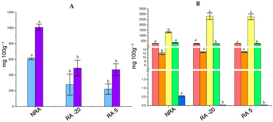 Figure 3 shows the concentration of carbohydrates and organic acids in cheeses. The concentration of lactose and galactose in cheeses ranged between 200 and 600 mg 100 g−1 and 400 and 1000 mg 100 g−1, respectively. Statistical differences (p < 0.05) were observed for both sugars, which presented a lower concentration in RA -20 and RA 5 compared to NRA. On the other hand, the concentration of lactic acid was significantly higher in RA -20 and RA 5 (>2500 mg 100 g−1) than NRA (~1250 mg 100 g−1). During the first hours of cheesemaking, lactose is metabolized by the starter culture to lactic acid, contributing to developing the desired texture as well as acidity of the cheese [45]. Residual lactose and galactose may be metabolized by NSLAB or secondary cultures if they are added. In this context, the lower concentration of both lactose and galactose was attributed to the L73’s ability to metabolize this sugar in cheese [22]. The high level of galactose in NRA was expected as most S. thermophilus strains cannot use galactose as an energy source, and it is accumulated in the cheese during the ripening [45,49]. This accumulation can be detrimental to cheese quality since both residual lactose and galactose can be fermented by potential spoilage microorganisms [50]. For example, galactose-positive heterofermentative NSLAB (e.g., Lactobacillus wasatchensis) may cause a defect known as late gas formation in Cheddar cheese [51,52]. Therefore, the L73 capacity to metabolize galactose in the cheese environment highlights its potential to maintain cheese quality during ripening. Furthermore, the production of antimicrobial compounds such as lactic acid also contributes to its protective role. Interestingly, the incorporation of the ripening agents probably controlled or limited the growth of acetic acid-producing bacteria from the NSLAB group, since the level of acetic acid in NRA (~350 mg 100 g−1) was higher than the rest of the cheeses (~240 mg 100 g−1). It was not surprising that the levels of acetic acid in the miniature cheeses with the ripening agent did not increase, in contrast to the observations in cultured milk. Cheese is a more complex system in which matrix composition, microbiota, and long ripening times, among other factors, could have influenced the final concentration of this acid [53].