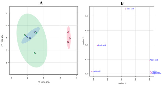 Finally, a principal component analysis (PCA) was used to map the relationships among cheese samples (Figure 4). The scores plot for the first two principal components (PC), which explained 93.2% of the total variance, revealed a clear separation between cheeses with and without the ripening agent. The three replicates of the NRA samples were grouped on the positive side of PC 1 and were associated with acetic acid, lactose, galactose, and hippuric acid, as can be seen in the loading plot. On the contrary, replicates of RA -20 and RA 5 were grouped on the negative side of PC1 and were associated with lactic acid and orotic acid.